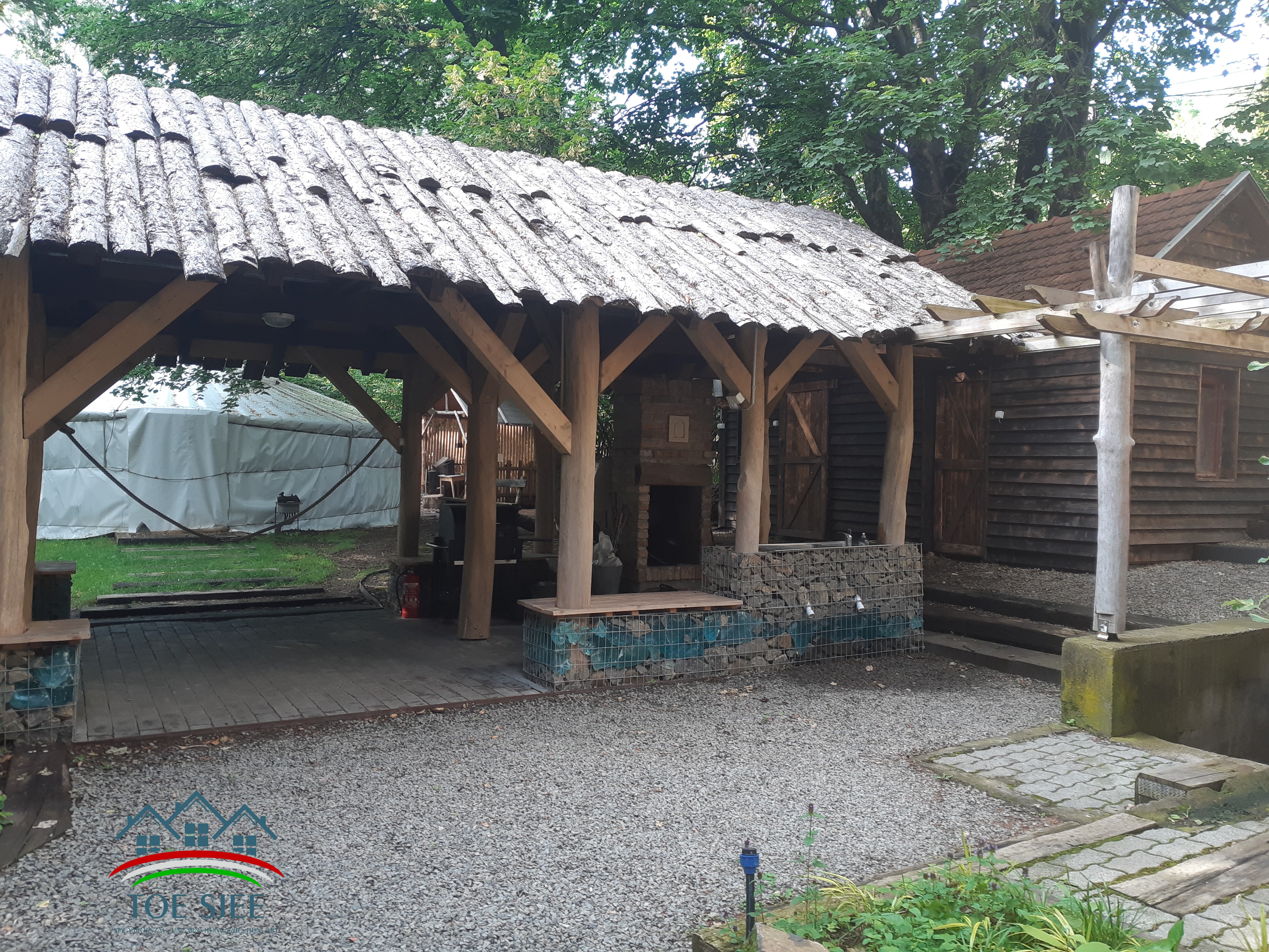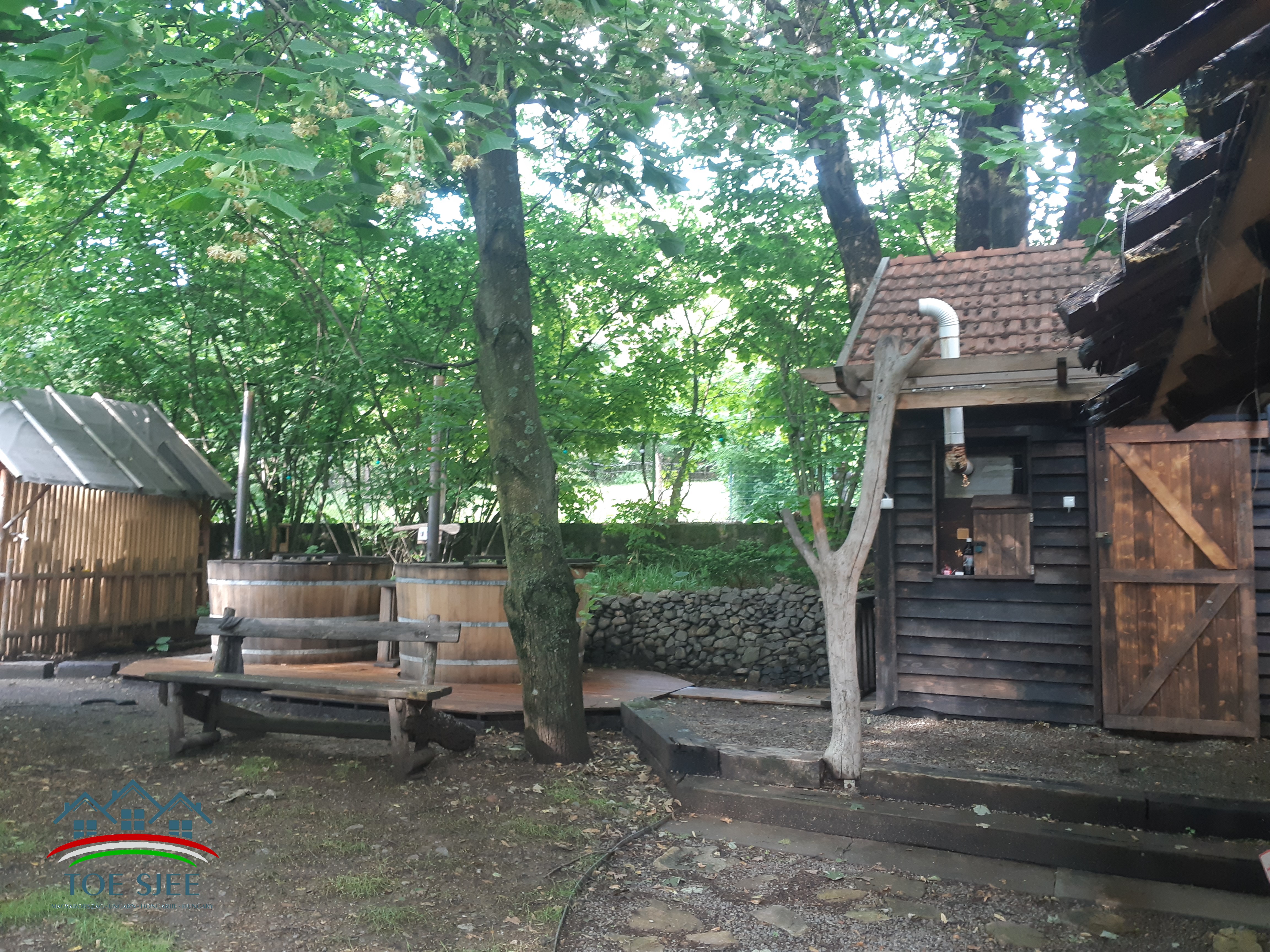 Az ingatlan egy 1237 m2-es telken helyezkedik el. A főépülethez kapcsoltan található egy 3 szintes élő fenyős faterasz, mely szintén tökéletes helyszín egy kellemes beszélgetésre vagy kisebb csoport számára egy rendezvényre. A vendégek kényelmét egy 6 személyes szaunaház is biztosítja, valamint 2 db szintén 6 személyes fatüzelésű szabadtéri dézsafürdő. Ezek mellett szintén megtalálható egy 8 méter átmérőjű téliesített fűthető jurta is, mely szintén megfelelő rendezvény helyszín lehet. Szintén található a kertben egy nagy méretű fedett kerti pavilon,„boksatetős hutaház” nyújt fedett, de mégis szabadtéri tartózkodási helyszínt grillezővel és búbos kemencével. Az ingatlan 2020-2022-ben teljes körű gépészeti (víz-, fűtésrendszer) felújításon és belsőépítészeti átalakításon esett át. A vendégház teljes felszerelésével, berendezési tárgyaival, eszközeivel eladó.